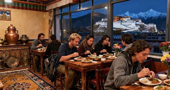 *A small group of international tourists are savoring Tibetan dishes in Lhasa for the first time in their lifetime.*