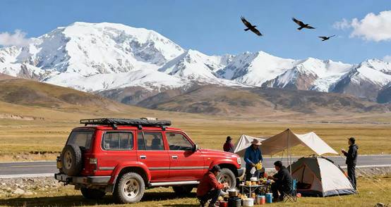 *Some travelers are cooking food by the side of the road during their sacred driving journey via a land cruiser vehicle in Tibet.*