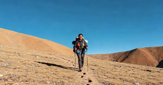 *A trekker descends from the high pass of Zhugar La, surrounded by boundless sky.*