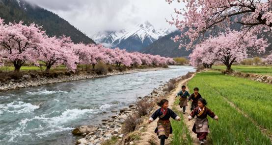 *A group of Tibetan children are gamboling in the vernal zephyr with sakura blossoming in Tibet.*